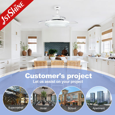Descrizione diLED Ceiling FanIl corpo bianco da 42 pollici, le pale trasparenti in PC e il telaio bianco rendono questo ventilatore da soffitto con luce pieno di stile moderno, molto adatto per l'installazione in soggiorno, camera da letto e studio.