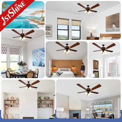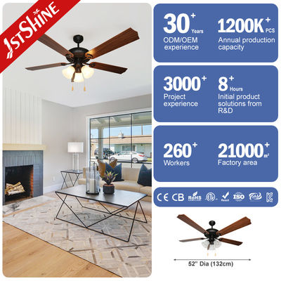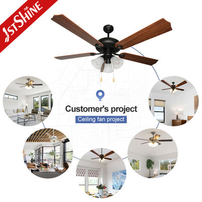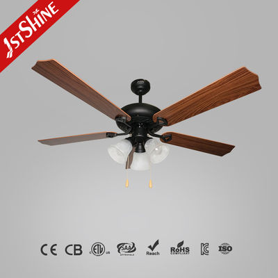 Un design elegante: Cinque lame finite con grano di legno accoppiate a lampade di vetro di tulipano per un'estetica calda e vintage